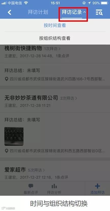 1.3 拜访记录列表优化,展示所有拜访记录,还可按照拜访人、客户和时间切换查看拜访记录信息。