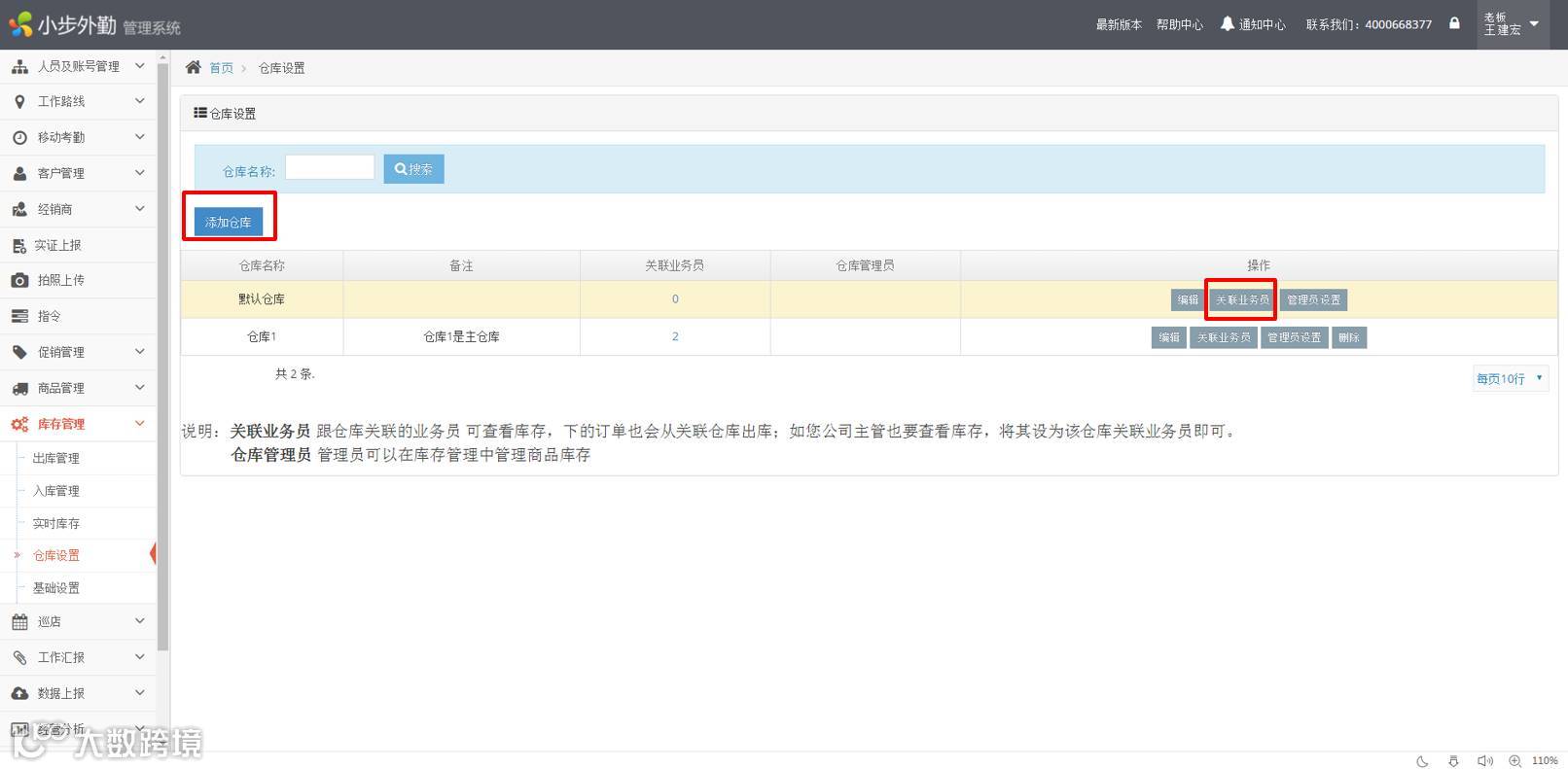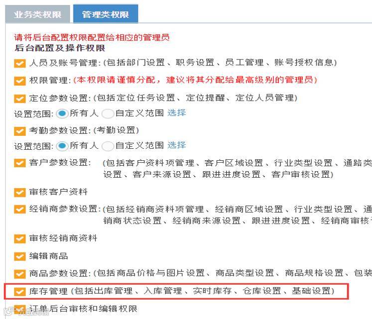 1、在PC端,登录Admin账号中打开库存功能,并对相关人员进行库存管理授权。