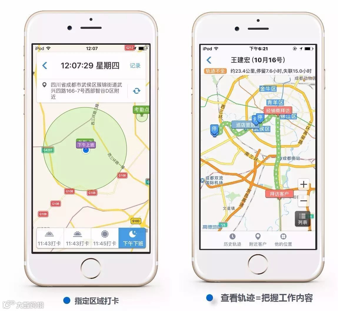 员工到达客户现场后,通过手机拍照打卡,确保员工准时到岗开展工作;详细的工作路线图展示员工一天的工作轨迹;