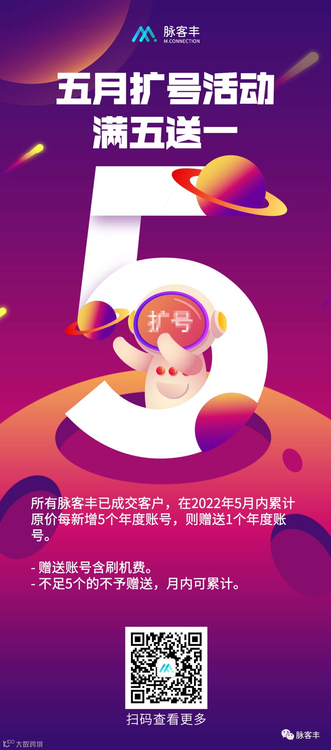 脉客丰已成交客户,5月累计原价新增5个年度账号,则赠送1个年度账号(含刷机费)。