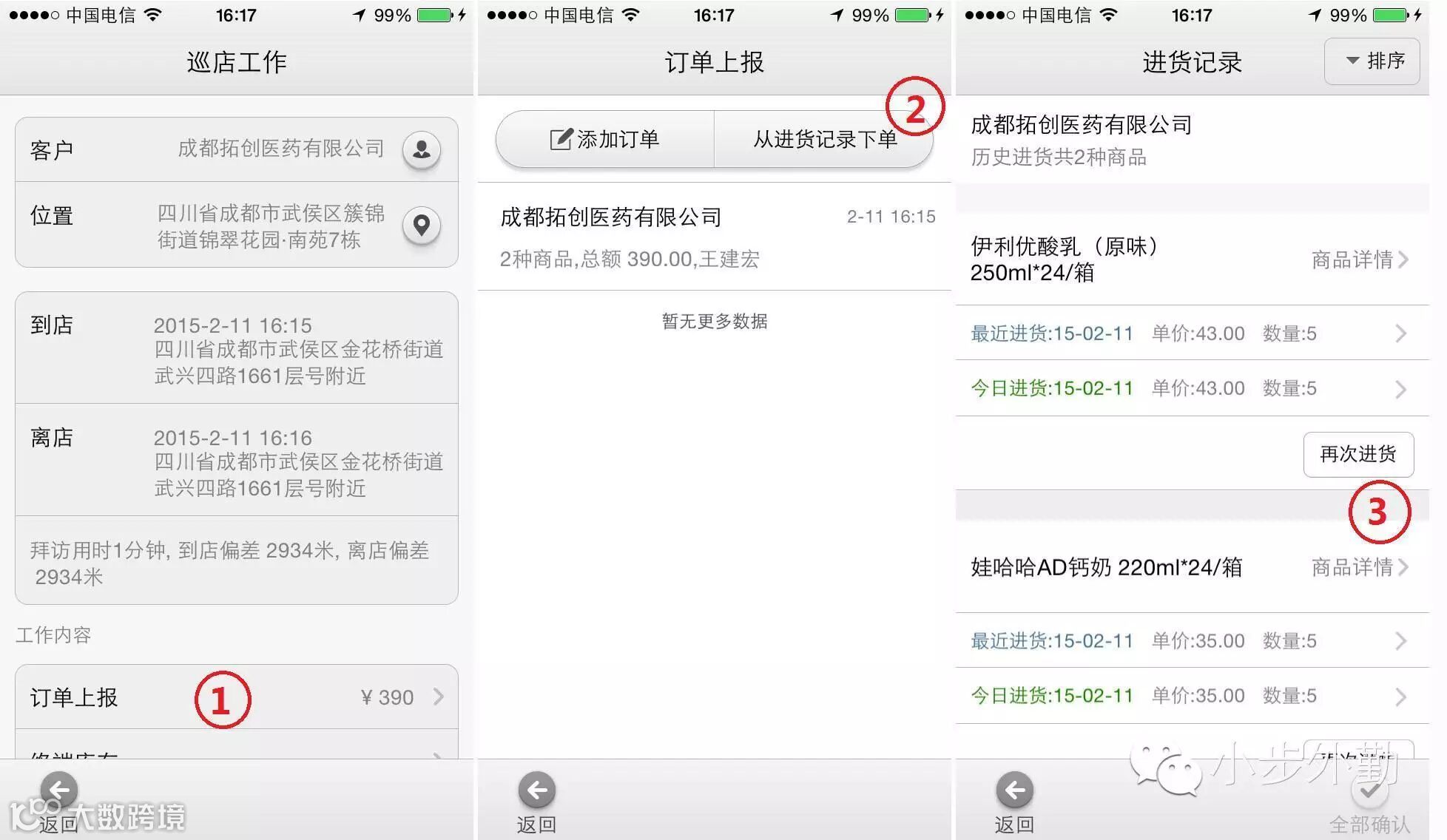 在二批配货下单方面:小步外勤新增了“主动打印订单”的功能。在业务员巡店配货时通过APP下单,二级批发商处即可打印出配送货表!帮助娃哈哈解决了:1、配送货不及时;2、统一了以前通过纸质抄单、电话和微信等多渠道下单方式,业务配送凭证更清晰;3、节约了业务员在二批商于终端之间的往返时间!