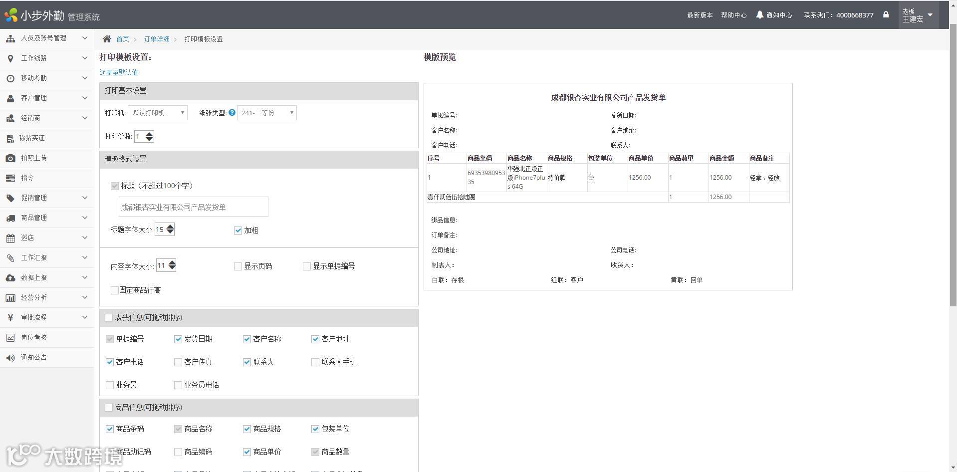 3、后台订单打印新增6种打印纸张规格,自由选择打印机;打印样式自定义,为企业节省打印纸张。适配不同企业的需求,提高打印效率!