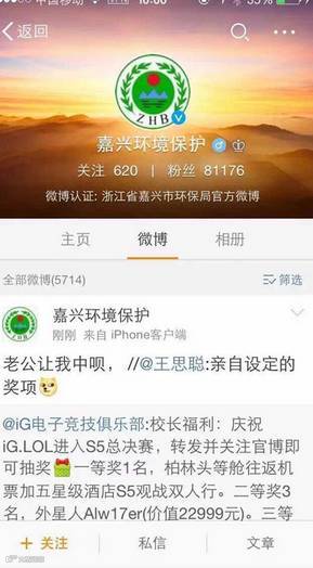 “老公让我中呗。”今天上午,嘉兴市环保局官方微博“嘉兴环境保护”转发了被奉为“国民老公”王思聪的一条微博,并配上了如此令人咋舌的评论,一时间被网友议论。