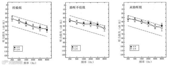 本研究共招募60例(20例/组)受试者,具体为:经验组:男8例,女12例;平均年龄66.8 ± 5.2 岁;由助听器使用经验丰富的用户组成(即使用助听器1年,每天使用时间超过8小时)。助听不佳(in-the-drawer)组:男13例,女7例;平均年龄66.2±4.9岁;由曾经购买过助听器,但没有经常使用的用户组成(即在过去2年内购买的助听器,但每周使用不到8小时)。未助听(first-time)组:男10例,女10例;平均年龄68.5±7.3岁;由有听力困难,但从未尝试和配戴助听器者组成。各组的听阈范围及平均听阈见图1。
