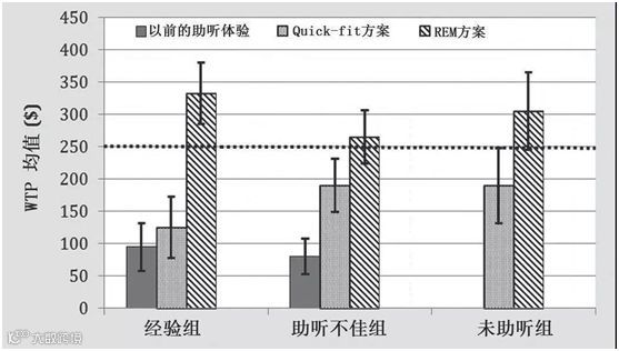 经验组和助听不佳组对已有的助听服务支付意愿(WTP)分别为95.00±29.85美元和80.00±27.26美元,在拟定服务价格250美元的标准内,两组间差异无统计学意义(P>0.05)。采用REM方案调试助听器后,其WTP较Quick-Fit方案均显著改善(P<0.01),具体为经验组对Quick-Fit和REM方案的WTP分别为125.00±47.32美元和332.50±47.32美元,且差异具有显著统计学意义(F2.17=20.04,P<0.001);助听不佳组对Quick-fit和REM方案的WTP分别为190.00±41.21 $和265.00±41.21美元,且差异具有统计学意义(F2.17=4.16,P<0.005);未助听组的Quick-fit和REM方案的WTP分别为195±46.32美元和335±46.32美元,且差异具有显统计学意义(F1.18=20.16,P<0.001)(采用MANOVA法,见图2)