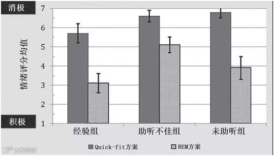 情绪测量是评估听力障碍者的对助听器接受和接纳程度的主要指标,包括对助听产品和服务体验的幸福感、成功感和信心。本研究采用非参数单向差异分析评估REM验证服务的情感价值,与Quick-fit方案相比(Krusal-Wallis检验),REM方案显著改善了经验组(X2=13.10,P<0.001),助听不佳组(X2=11.50,P<0.01)和未助听组(X2=14.75,P<0.001)这3个测试组中均显著改善(即更接近1的平均反应),见图3。