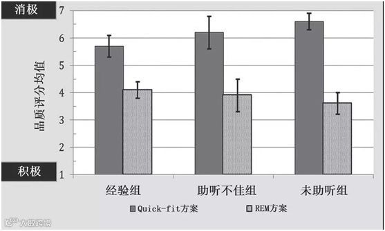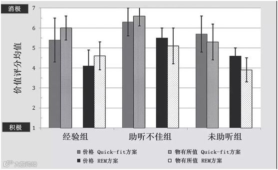 本研究受试者对专业服务的价值进行了评价,并对以下因素做出了回应:①价格;②物有所值。与Quick-fit方案相比(Krusal-Wallis检验),REM方案显著提高了经验组(X2=14.56,P<0.001)和未助听组(X2=13.71,P<0.001)受试者对的服务价值的评价;但在助听不佳组中未见统计学差异(X2=1.90,P>0.05),见图5。