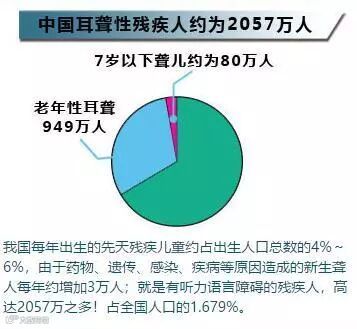 从上图的数据可以很清晰的看到,患有听力障碍的患者无论在全球范围内,还是国内,都占据了总人口的一小部分。并且根据不完全的统计,我国每年出生的先天残疾儿童约占出生人口总数的4%~6%,由于药物、遗传、感染、疾病等原因造成的新生聋人每年约增加3万人;就是有听力语言障碍的残疾人,高达2057万之多!占全国人口的1.679%。