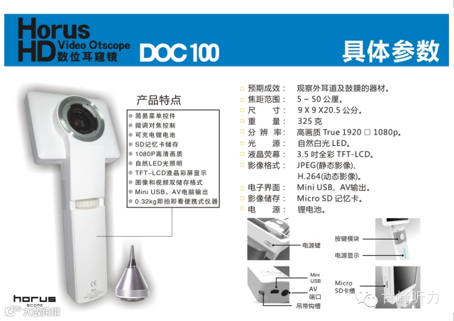 Horus DOC 100 是款来自台湾的数位耳窥镜,由台湾 Miis 公司研发,拥有 1080p 高清摄像头,使用 SD 记忆卡储存等多项高科技含量技术,目前 Horus DOC 100 已经取得国内注册证,产品在市场上也开始引起广泛关注。