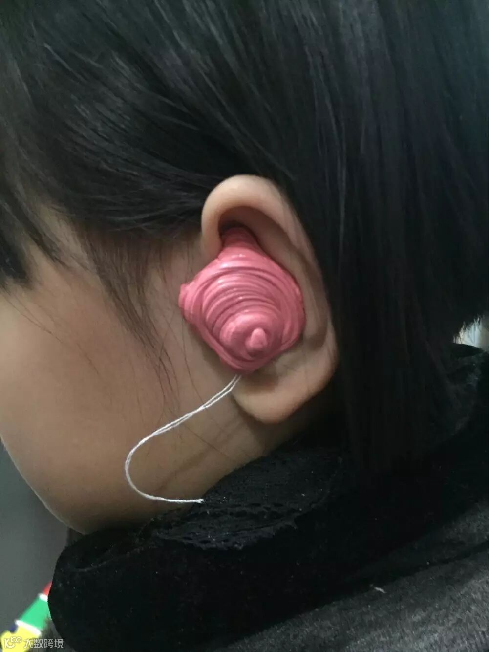 2. 在小儿耳道,插入堵耳器(即海绵球),其主要作用是放到耳道内,防止耳样材料流入到鼓膜出。为小儿取耳样的一个突出问题便是堵耳器使用不当。首先合格的堵耳器其大小适中,过大而堵耳器无法放入到耳道生出,致使耳样的耳道部分太短,过小的堵耳器则会使耳样材料,流入到耳道深处,无法成型,还会损伤鼓膜。堵耳器中间的线条必须结实,笔者看到有些堵耳器的线质量很差,稍稍往外一拉就断了,留在耳道的耳样就很难取出,严重的只有让医生取出。一般来讲,海绵球都应配有不同尺寸去满足不同大小的耳朵,尽量选取合适的堵耳器。