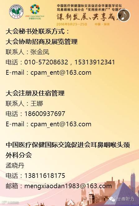 中国医疗保健国际交流促进会华夏医学论坛耳鼻咽喉头颈外科分会第一届学术会议,拟于 2016 年 9 月 23 — 25 日 在广东省深圳市举办。