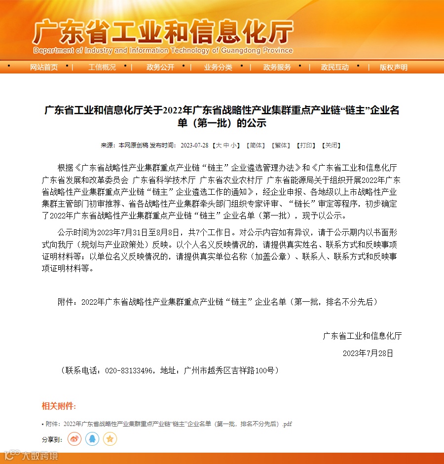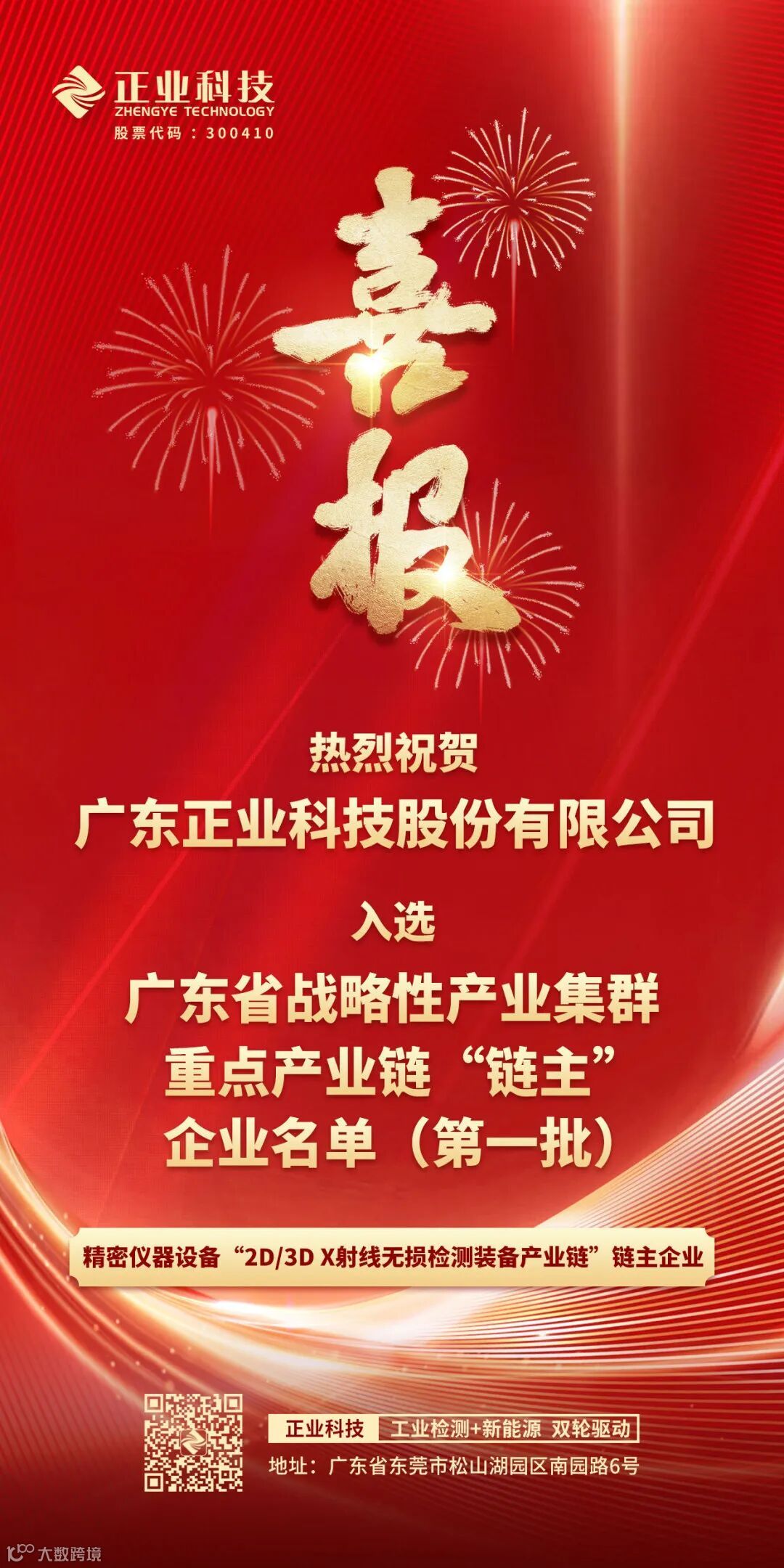 7月28日,广东省工业和信息化局官方网站发布了《广东省工业和信息化厅关于2022年广东省战略性产业集群重点产业链“链主”企业名单(第一批)的公示》,正业科技成功入选,确定为精密仪器设备“2D/3D X射线无损检测装备产业链”链主企业!