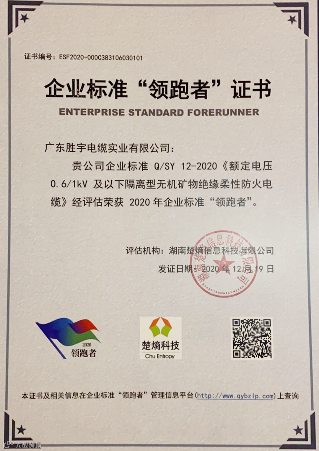 广东胜宇电缆实业有限公司凭借《额定电压0.6/1kV及以下隔离型无机矿物绝缘柔性防火电缆》获得柔性防火电缆类全国企业标准“领跑者”殊荣,该品类下全国仅2家入围!