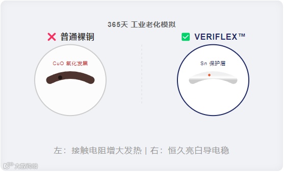 裸铜在潮湿或含盐雾环境下,极易被氧化成黑色的氧化铜(CuO),导致接触电阻增大发热。Veriflex™ 采用高纯度无氧铜镀锡工艺,给铜芯穿上一层“化学铠甲”。