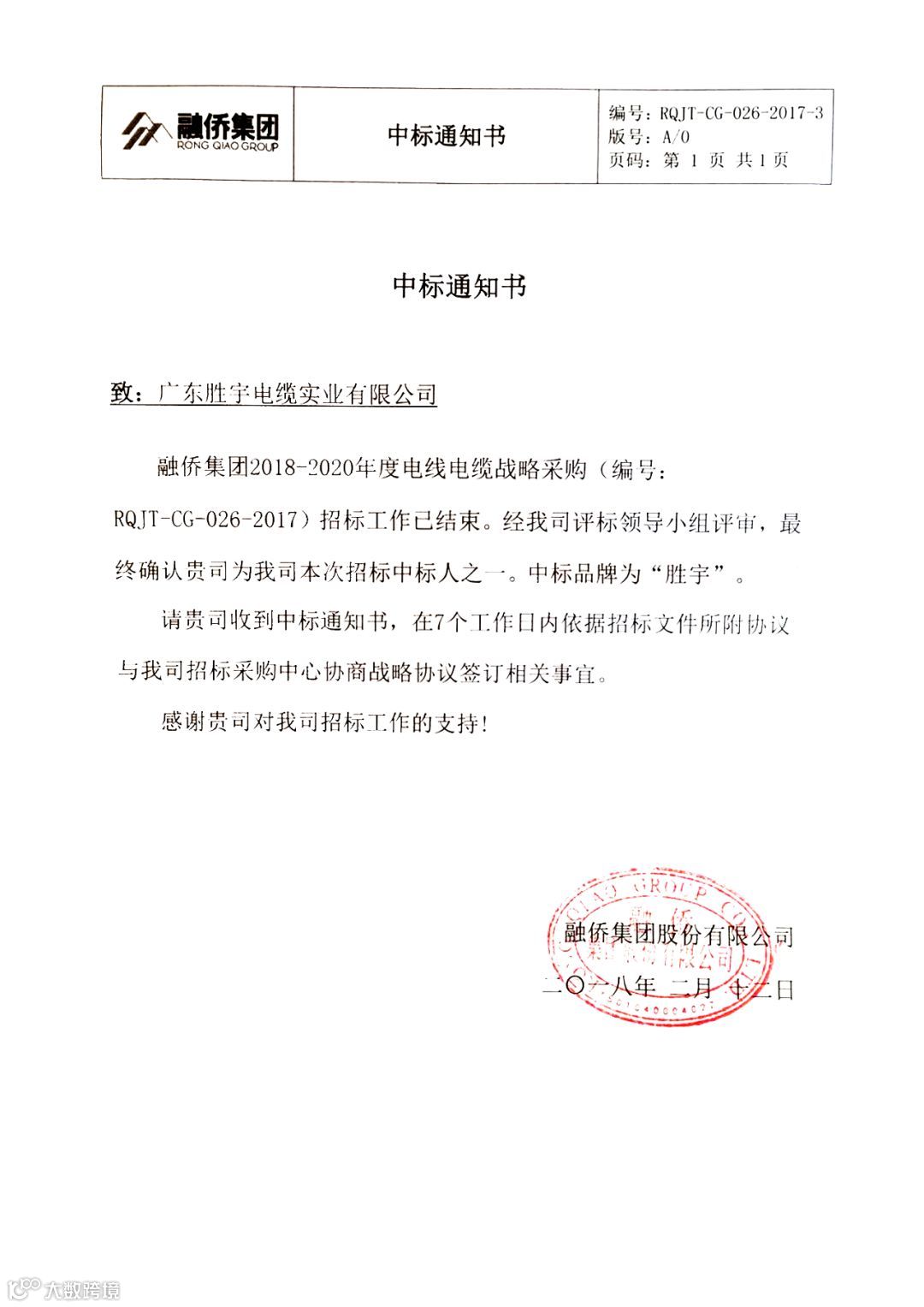 2月12日,胜宇电缆中标融侨集团2018-2020年度电线电缆战略采购,双方签订战略协议框架,打开福建房产领域重要市场。
