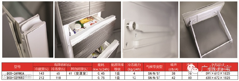 万宝冰箱 BCD-329WKC 与 万宝冰箱 BCD-249MCA 冰箱同位欧泊系列 款式为法式小队开:冷藏室为时尚美观的对开设计,软冷冻与冷冻室沿用了冰箱经典的单侧开设计。把手为暗扣手,美观、方便。