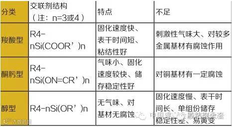根据密封胶主体聚合物的不同,可以分为硅酮密封胶、聚氨酯密封胶、聚硫密封胶、丁基密封胶、丙烯酸密封胶、沥青密封胶和改性类密封胶等。硅酮密封胶由于其在成本和耐候性上的巨大优势,使得其在建筑领域得到广泛应用。据2010年不完全统计,全球建筑类密封胶市场硅酮类占比超过70%,聚氨酯类占比20%左右,其它类密封胶占比不足10%,特别是在发达的欧美国家,由于轻质幕墙建筑的广泛使得硅酮类密封胶在其建筑市场中占据绝对主导地位,占比超过85%。硅酮类密封胶根据其交联剂种类又可以分为羧酸型、酮肟型和醇型等,其中发展中国家主要使用羧酸型硅酮密封胶,我国和欧美发达国家以酮肟型硅酮密封胶为主,醇型硅酮密封胶次之,羧酸型硅酮密封胶几乎已不使用。这三类硅酮密封胶的分类依据、特点与不足见下表: