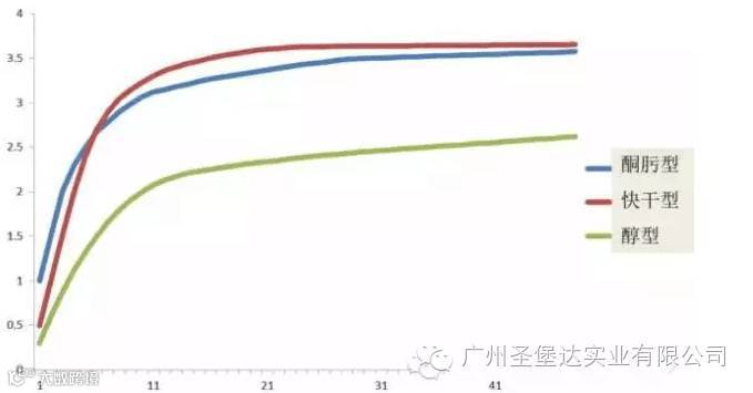 目前已有高品质的耐候性硅酮密封胶针对昼夜温差大,湿度低的施工环境,保证在施工过程中既不会起泡也不会起鼓,同时保证了建筑工程的安全,也满足了建筑美观的要求。这两方面的目的,可以通过调节硅酮胶的深层固化速度来实现。通过对配方的调整,包括改性交联剂的R基团、提高催化剂的催化活性、使用两种或多种交联剂的组合来提高硅酮胶的深层固化速度,使得硅酮胶在施工硫化过程中在发生较大的环境变化之前发生一定强度的深层固化,能够抵抗这种变化引起的伸缩位移。一般酮肟型、醇型和快干酮肟型硅酮胶的固化深度曲线如下图所示。