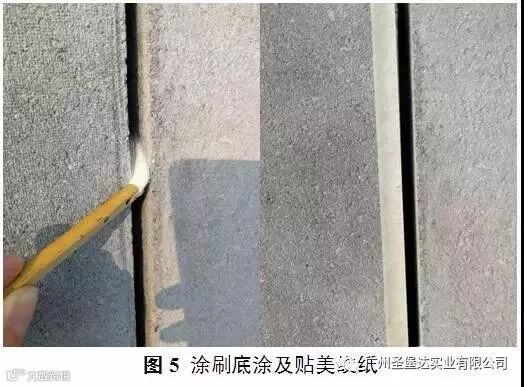 胶缝清理及衬垫材料填塞完成后,接下来需要涂刷底涂,不同厂家的底涂不能混用。涂刷底涂时,用毛刷蘸取适量底涂均匀涂刷在胶缝基材,待基材表面干燥后即可进行打胶。为保持外墙板美观,在胶缝基材两侧贴上美纹纸(如图5所示)。