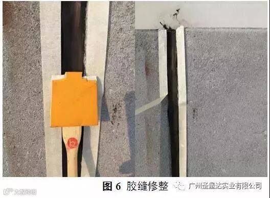 注胶应连续、均匀、饱满,避免注胶过程中引入气泡,注胶完成后,应尽快进行修整(如图6),缩短打胶与修整之间的间隔时间,避免密封胶表层固化后再进行修整,影响外观。修整完成后,撕下美纹纸。