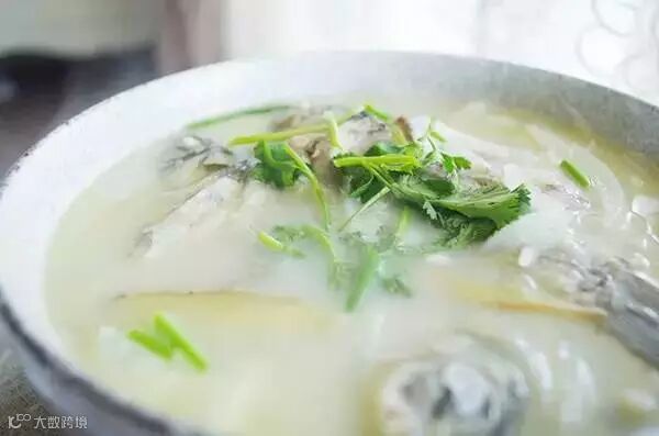 5.当鱼汤煮出奶油色加盐调味。