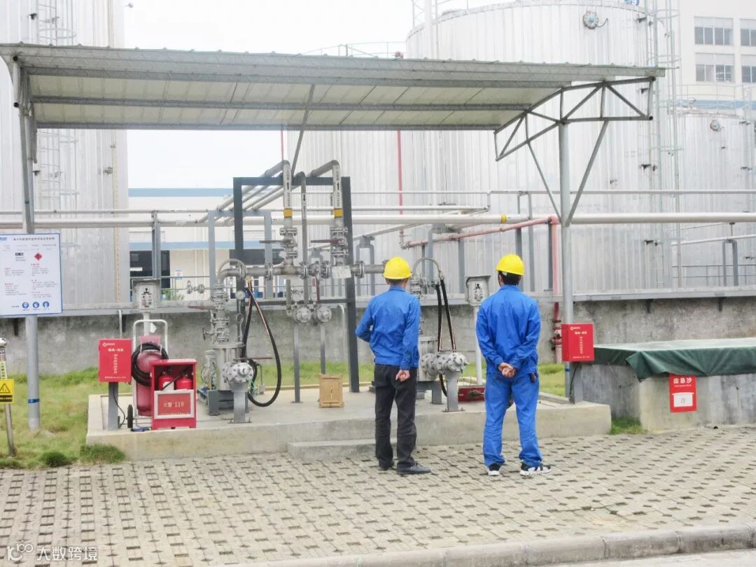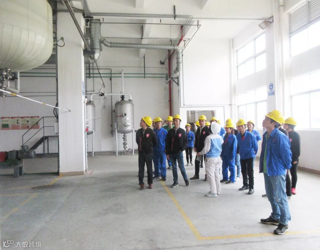 在彤德公司谭斌副总经理的引导下,公司员工先后参观了储罐区、反应车间、灌装车间、原料仓库、中转仓库、成品仓库。