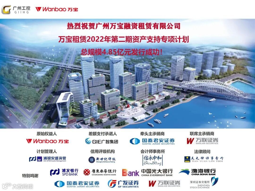 本次专项计划由上海浦银安盛担任计划管理人,国泰君安担任主承销商,万联证券联席承销,光大银行作为托管银行。广州工控为本期ABS发行提供了大力支持,委托广智集团担任差额支付承诺人,实现集团内部企业协同及优势互补。本期项目的成功发行,充分体现了资本市场投资者对万宝融资租赁的高度认可和支持,进一步巩固了公司在资本市场的优良口碑。