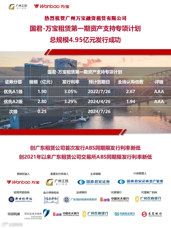 2021年9月8日,在广州工业投资控股集团有限公司(以下简称“广州工控集团”)的大力支持和指导下,广州万宝融资租赁有限公司(以下简称“万宝租赁”)作为原始权益人的“国君-万宝租赁第1期资产支持专项计划”于深交所成功发行。本次项目储架规模10亿元,首期发行规模4.95亿元,其中优先A档发行利率分别为3.05%和3.29%。本期资产支持专项计划发行是广州工控集团首个全资子公司在资产证券化领域的公开亮相。