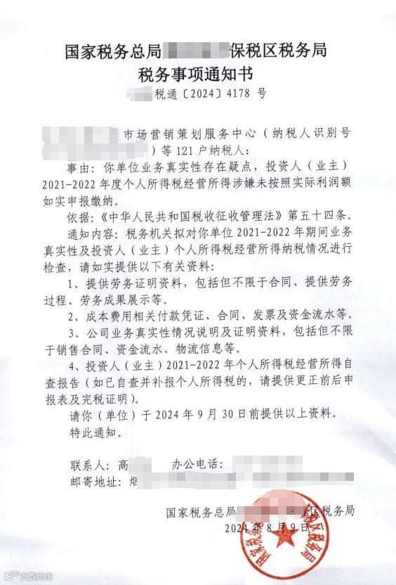 近日,某税务局发布了关于121家个体户的《税务事项通知书》,要求个体户对自己的业务真实性作出说明。