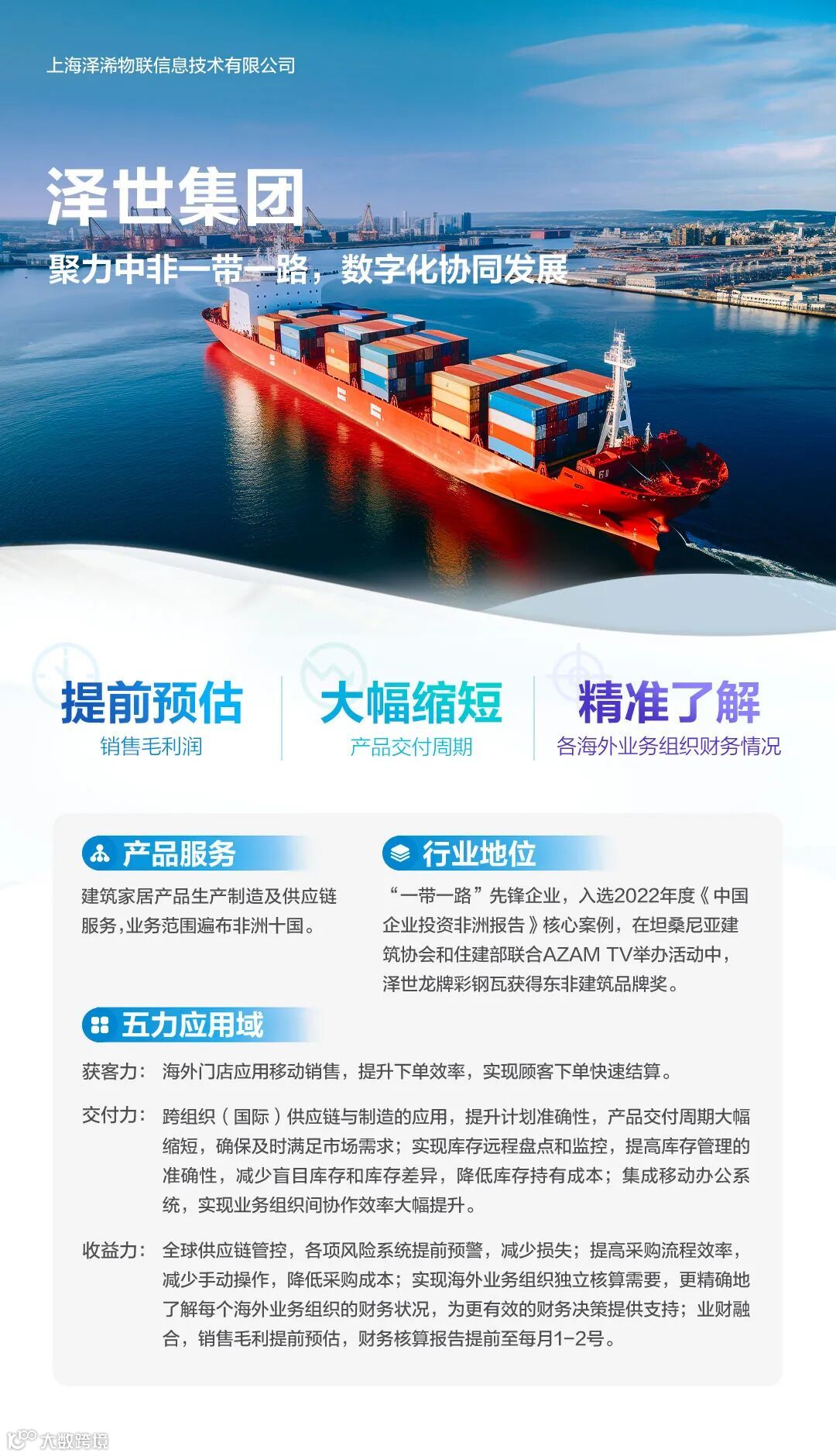 泽世集团是以“非洲”为市场定标,以“家”为产品布局,以“一链两双带”为战略实践,以“国际供应链服务、非洲商品平台&产业园、互联网O2O信息技术”为服务抓手的S2B2C商品供应链企业,其总部位于中国上海。下辖二十余家子公司分布于中国大陆、中国香港、新加坡、坦桑尼亚、肯尼亚、卢旺达、乌干达、赞比亚、刚果(金)、莫桑比克、马拉维、加纳、安哥拉等亚洲及非洲国家和地区。截至2023年底,已经进入非洲10余个国家,30余个大中城市,累计在非投资过亿美元,集团业务每年均复合增长超同行业均值。