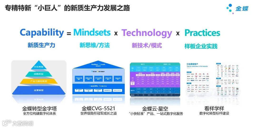 沉淀自3.9万家客户的成功实践,金蝶提炼出了为专精特新“小巨人”企业数字化转型构建新质生产力的公式,新质生产力=采用新思维/方法×新技术/模式×样板企业实践。
