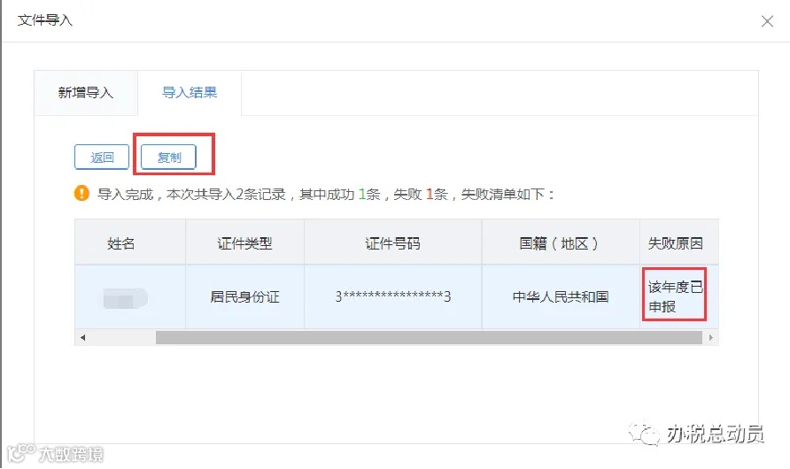 点击4、导入结果,可查看到导入记录,点击状态下的“存在失败”,可查看到失败的人员,移动到最右侧,可查看失败原因,系统同时支持复制失败人员的信息。