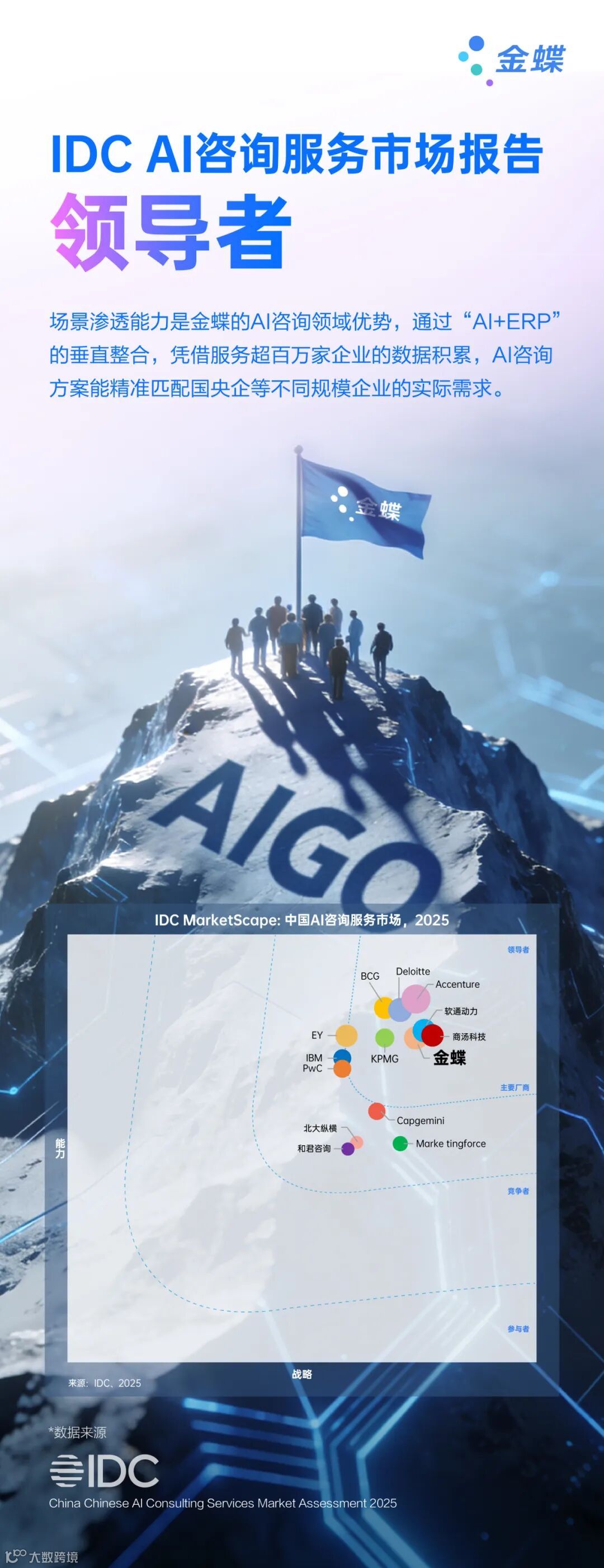 近日,国际权威研究机构 IDC 发布《IDC MarketScape:中国AI咨询服务市场 2025 年厂商评估》报告,金蝶凭借在AI战略规划、架构设计、场景识别与运营体系建设等方面的系统性能力,成功获评“领导者”(Leader)。这一评价充分肯定了金蝶在AI咨询服务领域的前瞻性布局与扎实落地能力。