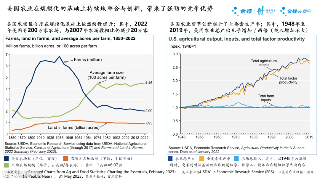 ▶ 规模化:美国在1935年达到680万家农场的峰值后,农场数量急剧下降;截至2022年美国有200万家农场,与2007年农场数相比仍减少20万家