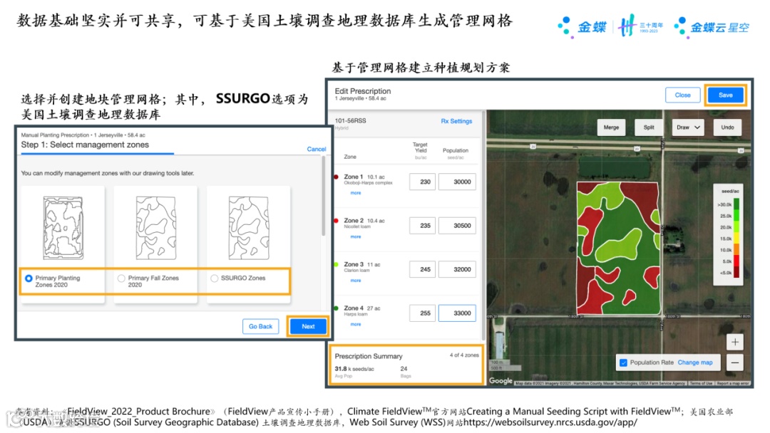 ▶ 数据基础:以FieldViewTM为例,可以直接基于美国土壤调查地理数据库SSURGO (Soil Survey Geographic Database)直接建立农田的管理网格(管理作业区)