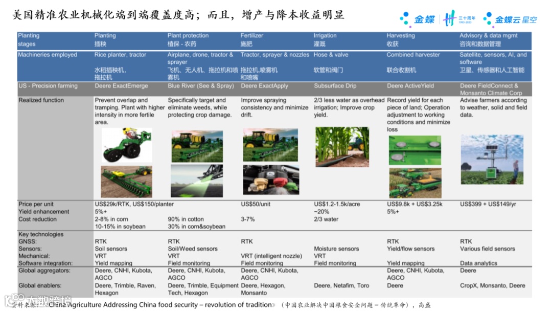 美国农业倾向于品类的聚合,玉米是产量最高的作物约占美国农场现金收入的30%, 其次是大豆约20%和小麦约5%【3】。而且,不采用田间进行套种、间作等品类规划与耕作方式,从而为机械化提供了非常适合的发展土壤。美国精准农业机械化可以对作物的整个生育期做到端到端的覆盖;如下图,从播种插秧、植保、水肥到收获【4】。其中,机械化技术上的创新与大范围应用(包括并不限于水稻插秧机、拖拉机、无人机、喷雾机、滴灌设备、联合收割机)使得美国农场获得了竞争力:
