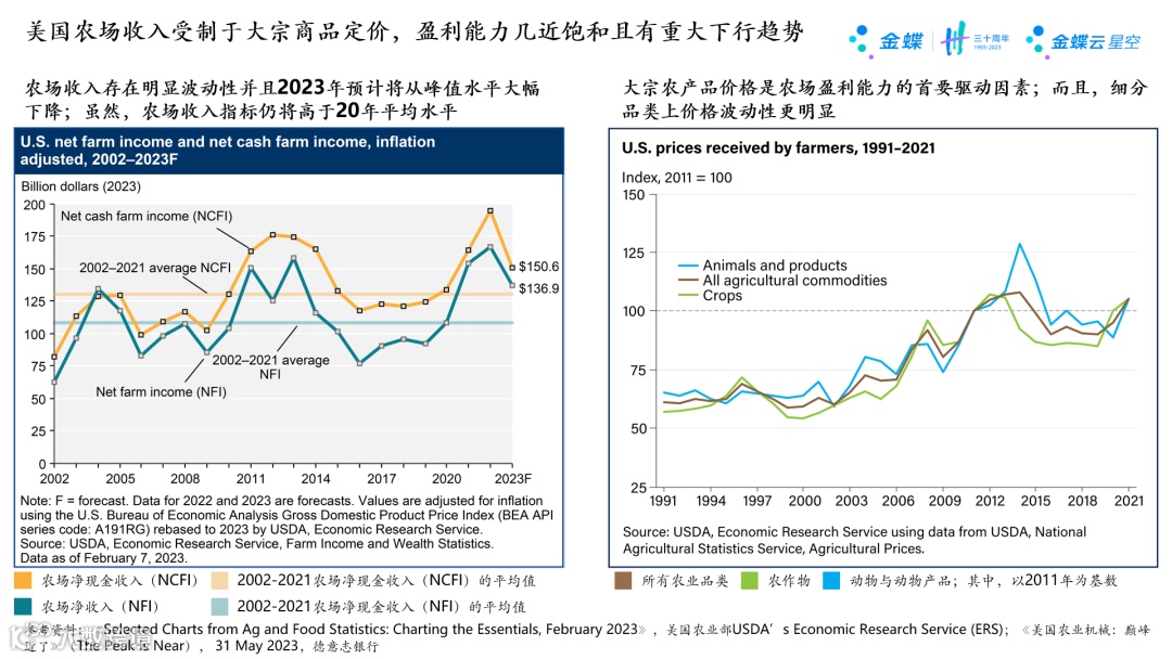 在“粮食金融化”的背景下,美国农场收入受制于大宗商品定价且呈现出大幅度的波动性(存在相应周期性);而且,2023年美国农场净收入预计将比2022年下降18.2%。德意志银行在最新的美国农业机械专题行业报告中使用了“几近巅峰”(The Peak Is Near)这样的题目表达了“强弩之末”的意思,未来美国农场进行大型机械采购的动力不足。
