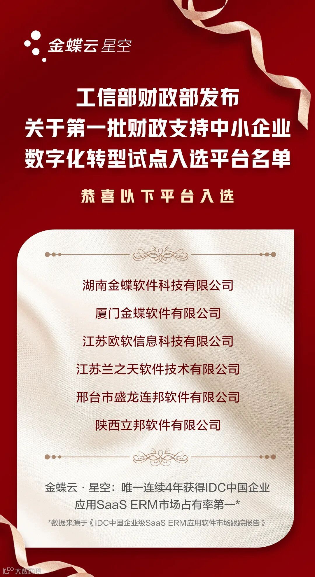 本次大会发布了由工业和信息化部会同财政部评选出“第一批财政支持中小企业数字化转型试点入选平台公示名单”,金蝶分公司及伙伴共有6家入选,数量遥遥领先,包括湖南金蝶软件科技有限公司、厦门金蝶软件有限公司、江苏欧软信息科技有限公司、江苏兰之天软件技术有限公司、邢台市盛龙连邦软件有限公司、陕西立邦软件有限公司。