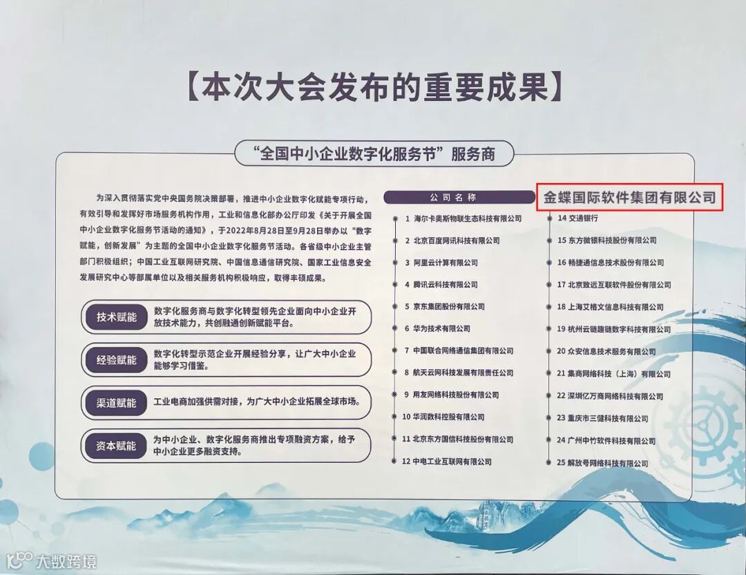 为深入推进中小企业数字化赋能专项行动,引导广大中小企业加快数字化转型,工信部于8月28日至9月28日举办“全国中小企业数字化服务节”活动。在本次大会上,公布了“全国中小企业数字化服务节”服务商名单。金蝶作为其中一员,将积极配合相关举措,充分发挥优秀数字化服务商专业优势,多方联动,协调相关资源,帮助广大中小企业打造走在技术前沿的数字化运营支撑体系,提升企业业务能力,实现“数治企业,韧性成长”。