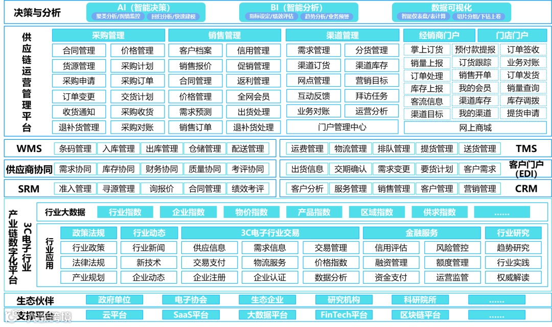 综上所述,3C电子行业企业供应链的数字化转型框架如下图所示,涉及行业与企业内部供应链运营管理的多个方面,包括ERP、CRM、SRM、WMS、TMS等及3C电子产业链数字化平台等相应的产业或应用平台、电商平台与门户与EDI技术等,从而促进3C电子行业企业供应链的数字化转型。