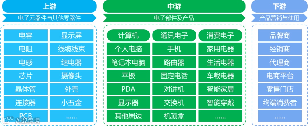 3C电子产业链由上中下游组成,主要包括上游的芯片、电容阻感、显示屏、PCB、连接器、传感器、线束、继电器及摄像头等电子元器件与外壳、小五金等其他各种零器件、中游的主板、控制板、显卡、声卡、物联网卡等各种电子模组与部件及手机、电脑、耳机、音响、鼠标、键盘、路由器、机顶盒、电视、冰箱、空调等各种产品生产与制造、下游的经销商、代理商、零售门店、终端消费者以及电商平台等。