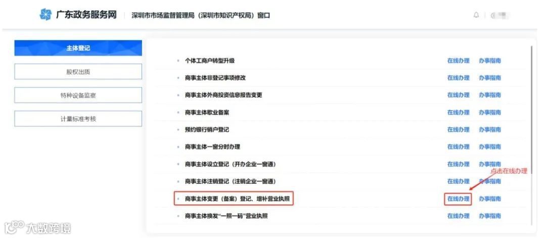 5、找到“商业主体变更(备案)登记、增补营业执照”,点击办理进入