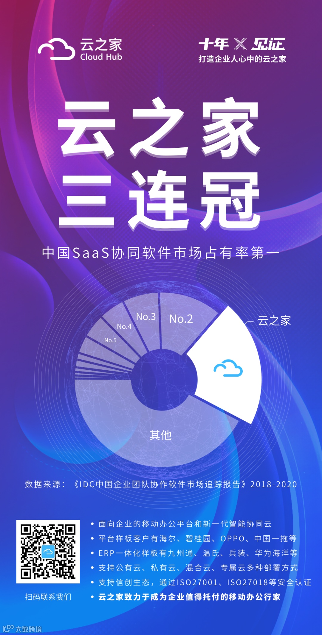 云之家是面向企业服务的移动办公平台&新一代智能协同云,我们坚持以客户为中心,以奋斗者为本,以全心全意为企业服务、改变亿万人工作方式为公司使命,致力于成为值得托付的移动办公行家。据研究机构IDC数据显示,2015年起云之家连续三年蝉联大中型企业移动办公市场用户数第一;2018年至今持续摘冠中国SaaS协同软件市场;2021年IDC发布的《中国企业团队协作云2021厂商评估》报告中,云之家位居领导者象限。