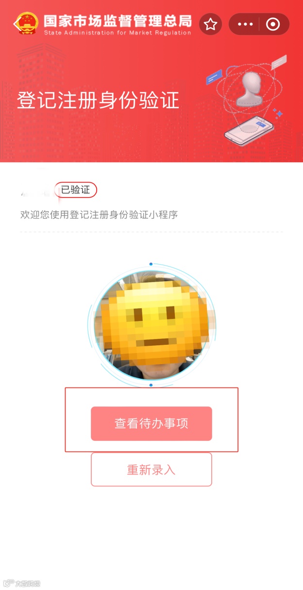 1、身份核验成功后,小程序将展示用户扫脸图片,由用户确认,无误后点击【查看待办事项】按钮,进入待办事项页面。用户点击【重新录入】按钮,返回用户信息录入环节。