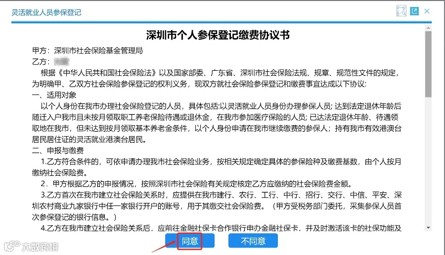 阅读《深圳市个人参保缴费协议书》,并点击【同意】
