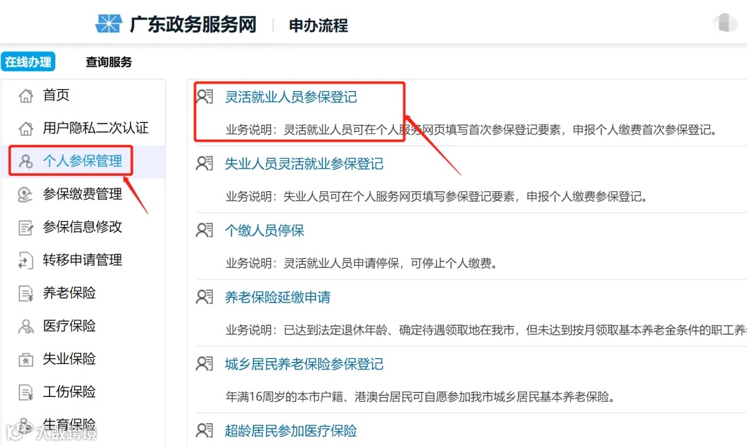 登录进入后,选择【在线办理】-【个人参保管理】-【灵活就业人员参保登记】