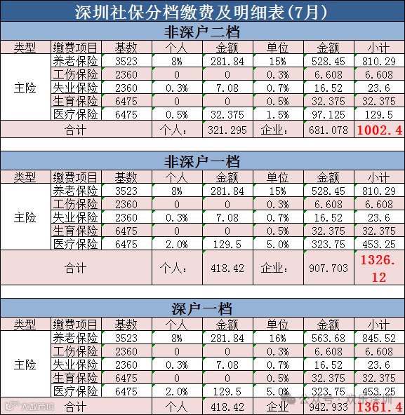 ①2024年7月深圳市养老保险最低缴费基数是3523元(8807*40%),一档、二档和退休后延交医保的基数都相应调整