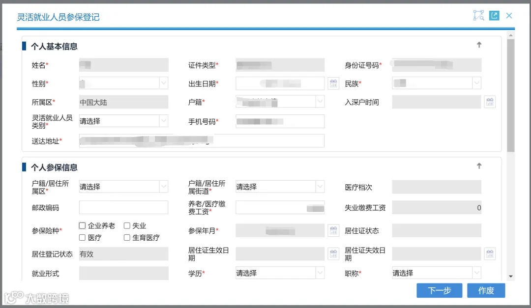 下滑需要填写就业单位信息(就是填写你灵活就业服务的公司,比如说你做自媒体是服务于哪个平台等):