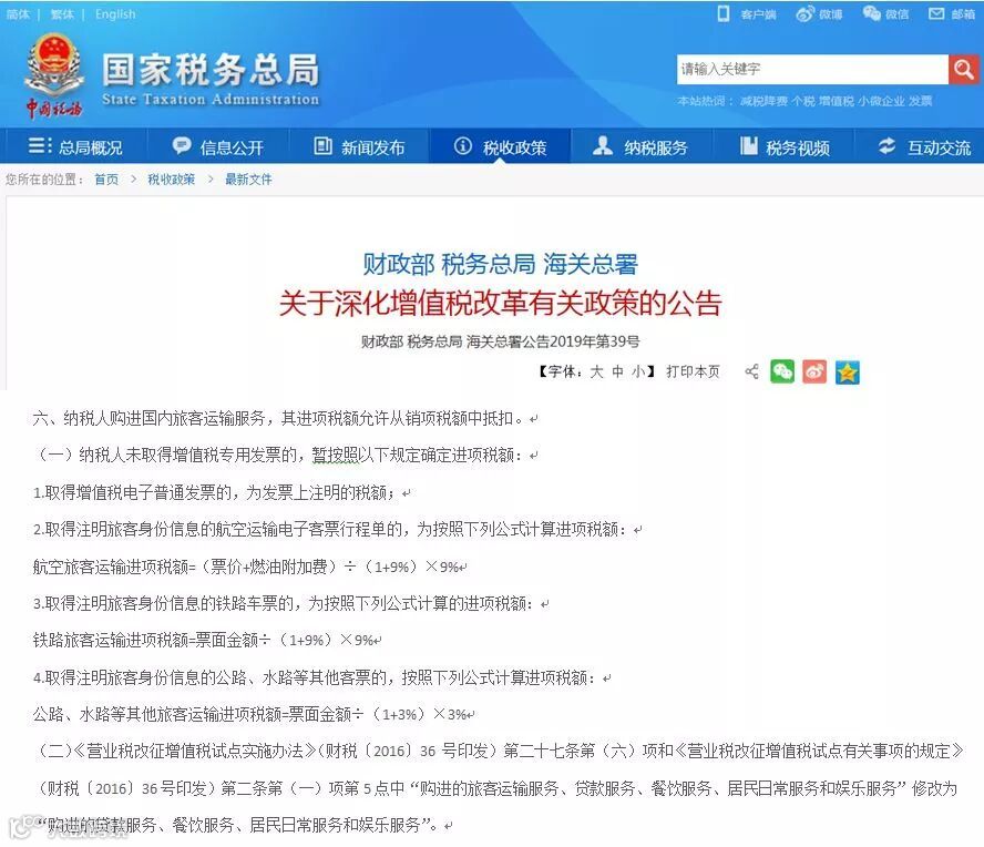 财政部 税务总局 海关总署公告2019年第39号《关于深化增值税改革有关政策的公告》: