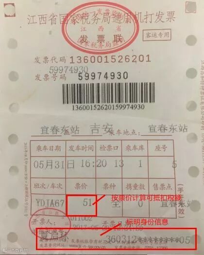 另外需要注意的是:火车、飞机、还有一些长途客运基本都是实名购票,票据打印出来肯定注明的都是旅客身份信息,但是还有些确实不会打印身份信息,比如一些出租车发票,客运定额发票等,按规定,这些不能计算抵扣。